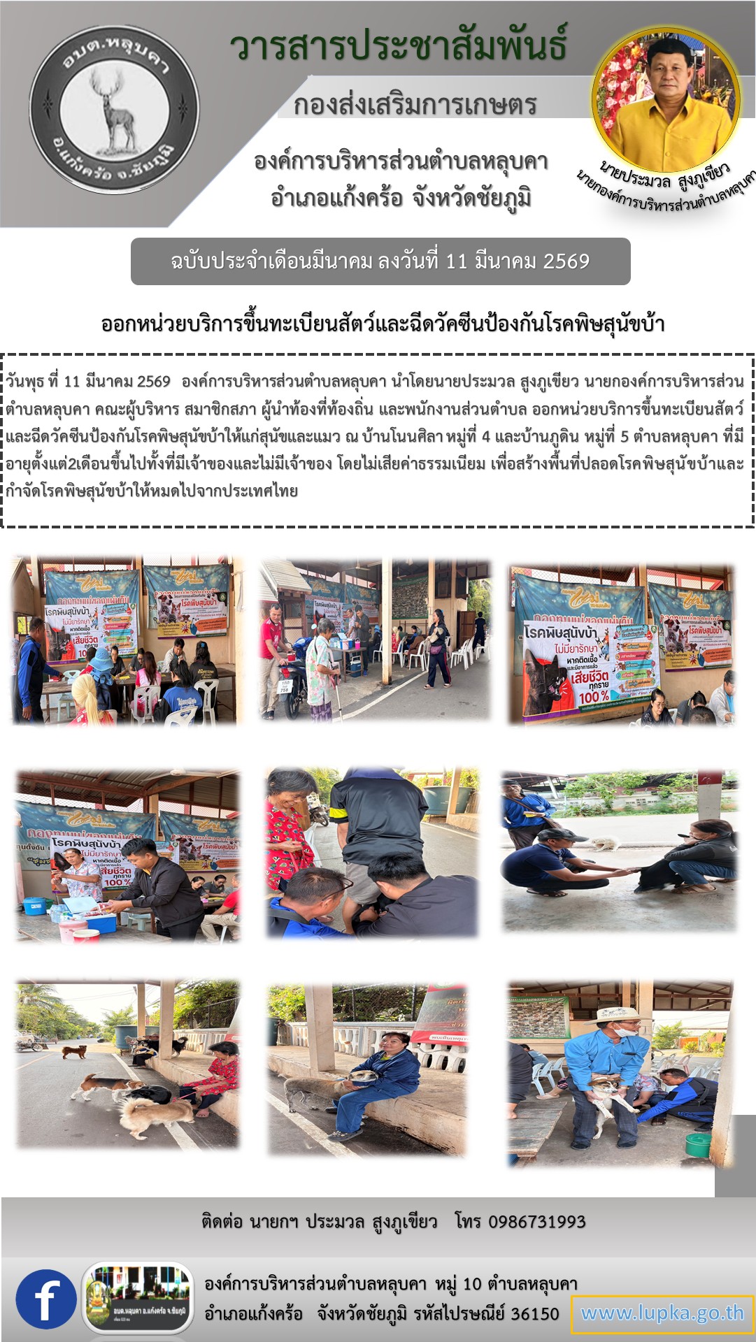 วันพุธ ที่ 11 มีนาคม 2569 องค์การบริหารส่วนตำบลหลุบคา นำโดยนายประมวล สูงภูเขียว นายกองค์การบริหารส่วนตำบลหลุบคา คณะผู้บริหาร สมาชิกสภา ผู้นำท้องที่ท้องถิ่น และพนักงานส่วนตำบล ออกหน่วยบริการขึ้นทะเบียนสัตว์และฉีดวัคซีนป้องกันโรคพิษสุนัขบ้าให้แก่สุนัขและแมว ณ บ้านโนนศิลา หมู่ที่ 4 และบ้านภูดิน หมู่ที่ 5 ตำบลหลุบคา ที่มีอายุตั้งแต่2เดือนขึ้นไปทั้งที่มีเจ้าของและไม่มีเจ้าของ โดยไม่เสียค่าธรรมเนียม เพื่อสร้างพื้นที่ปลอดโรคพิษสุนัขบ้าและกำจัดโรคพิษสุนัขบ้าให้หมดไปจากประเทศไทย