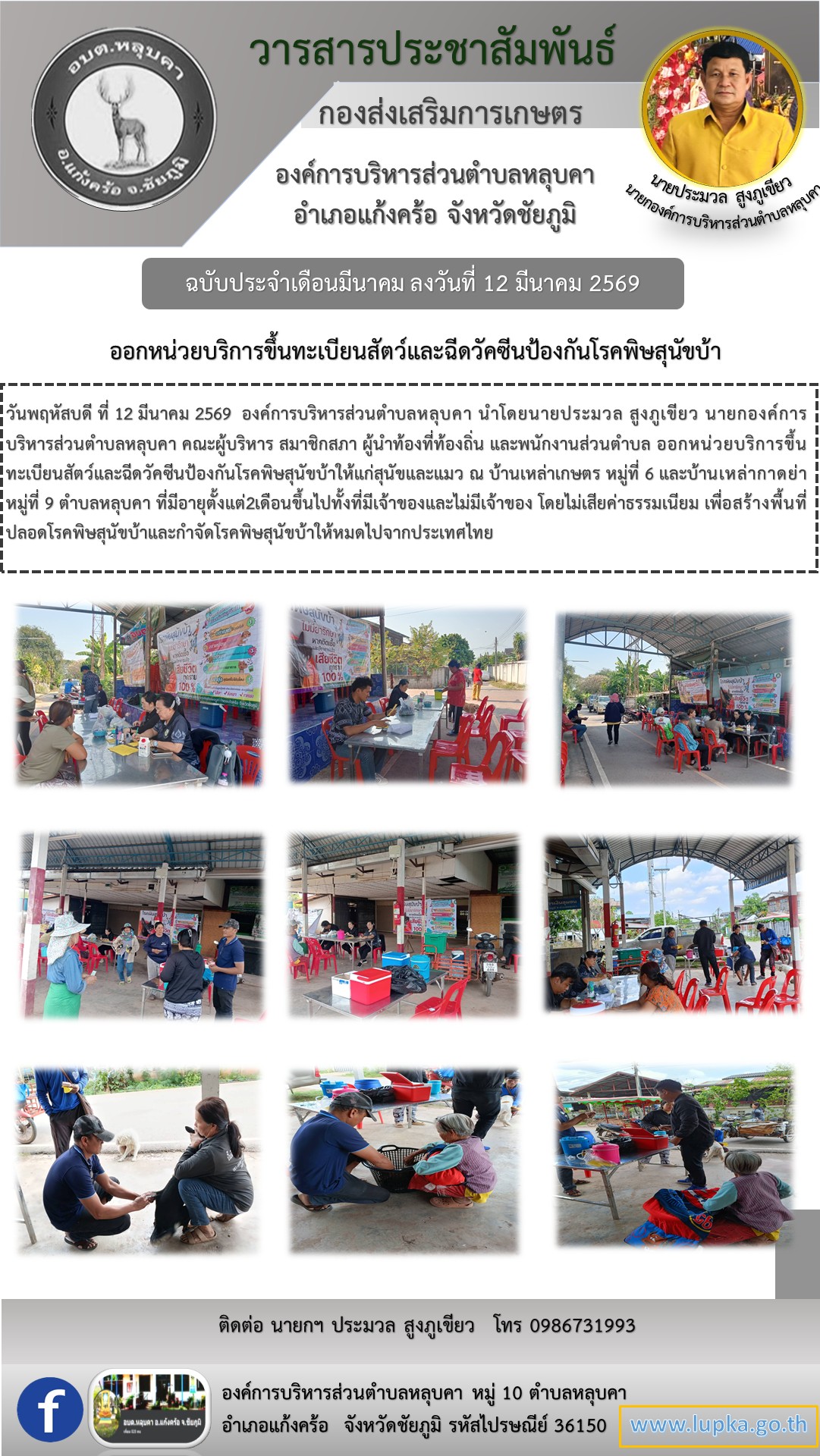 วันพฤหัสบดี ที่ 12 มีนาคม 2569 องค์การบริหารส่วนตำบลหลุบคา นำโดยนายประมวล สูงภูเขียว นายกองค์การบริหารส่วนตำบลหลุบคา คณะผู้บริหาร สมาชิกสภา ผู้นำท้องที่ท้องถิ่น และพนักงานส่วนตำบล ออกหน่วยบริการขึ้นทะเบียนสัตว์และฉีดวัคซีนป้องกันโรคพิษสุนัขบ้าให้แก่สุนัขและแมว ณ บ้านเหล่าเกษตร หมู่ที่ 6 และบ้านเหล่ากาดย่า หมู่ที่ 9 ตำบลหลุบคา ที่มีอายุตั้งแต่2เดือนขึ้นไปทั้งที่มีเจ้าของและไม่มีเจ้าของ โดยไม่เสียค่าธรรมเนียม เพื่อสร้างพื้นที่ปลอดโรคพิษสุนัขบ้าและกำจัดโรคพิษสุนัขบ้าให้หมดไปจากประเทศไทย