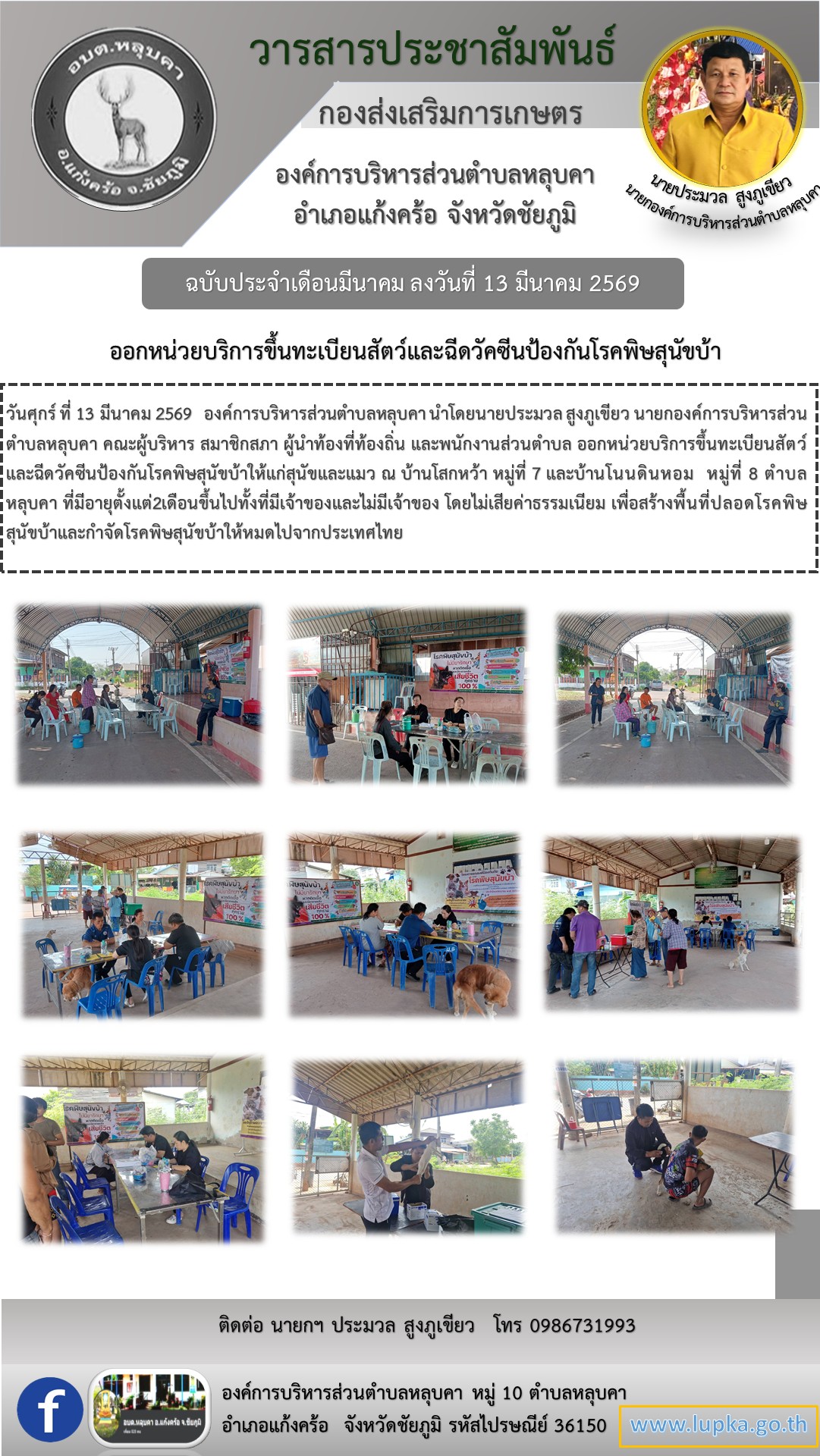 วันศุกร์ ที่ 13 มีนาคม 2569 องค์การบริหารส่วนตำบลหลุบคา นำโดยนายประมวล สูงภูเขียว นายกองค์การบริหารส่วนตำบลหลุบคา คณะผู้บริหาร สมาชิกสภา ผู้นำท้องที่ท้องถิ่น และพนักงานส่วนตำบล ออกหน่วยบริการขึ้นทะเบียนสัตว์และฉีดวัคซีนป้องกันโรคพิษสุนัขบ้าให้แก่สุนัขและแมว ณ บ้านโสกหว้า หมู่ที่ 7 และบ้านโนนดินหอม หมู่ที่ 8 ตำบลหลุบคา ที่มีอายุตั้งแต่2เดือนขึ้นไปทั้งที่มีเจ้าของและไม่มีเจ้าของ โดยไม่เสียค่าธรรมเนียม เพื่อสร้างพื้นที่ปลอดโรคพิษสุนัขบ้าและกำจัดโรคพิษสุนัขบ้าให้หมดไปจากประเทศไทย