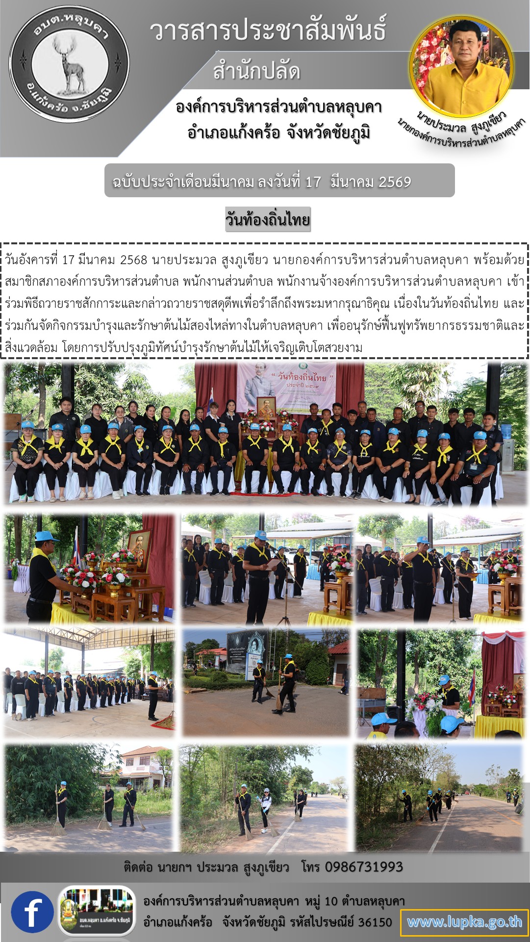 วันอังคารที่ 17 มีนาคม 2569 นายประมวล สูงภูเขียว นายกองค์การบริหารส่วนตำบลหลุบคา พร้อมด้วยสมาชิกสภาองค์การบริหารส่วนตำบล พนักงานส่วนตำบล พนักงานจ้างองค์การบริหารส่วนตำบลหลุบคา เข้าร่วมพิธีถวายราชสักการะและกล่าวถวายราชสดุดีพเพื่อรำลึกถึงพระมหากรุณาธิคุณ เนื่องในวันท้องถิ่นไทย และร่วมกันจัดกิจกรรมบำรุงและรักษาต้นไม้สองไหล่ทางในตำบลหลุบคา เพื่ออนุรักษ์ฟื้นฟูทรัพยากรธรรมชาติและสิ่งแวดล้อม โดยการปรับปรุงภูมิทัศน์บำรุงรักษาต้นไม้ให้เจริญเติบโตสวยงาม