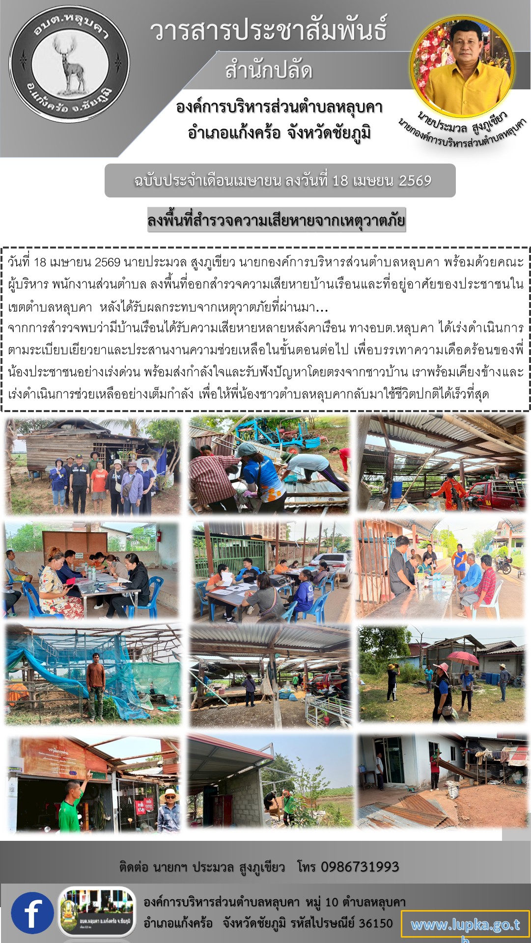 วันที่ 18 เมษายน 2569 นายประมวล สูงภูเขียว นายกองค์การบริหารส่วนตำบลหลุบคา พร้อมด้วยคณะผู้บริหาร พนักงานส่วนตำบล ลงพื้นที่ออกสำรวจความเสียหายบ้านเรือนและที่อยู่อาศัยของประชาชนในเขตตำบลหลุบคา หลังได้รับผลกระทบจากเหตุวาตภัยที่ผ่านมา…